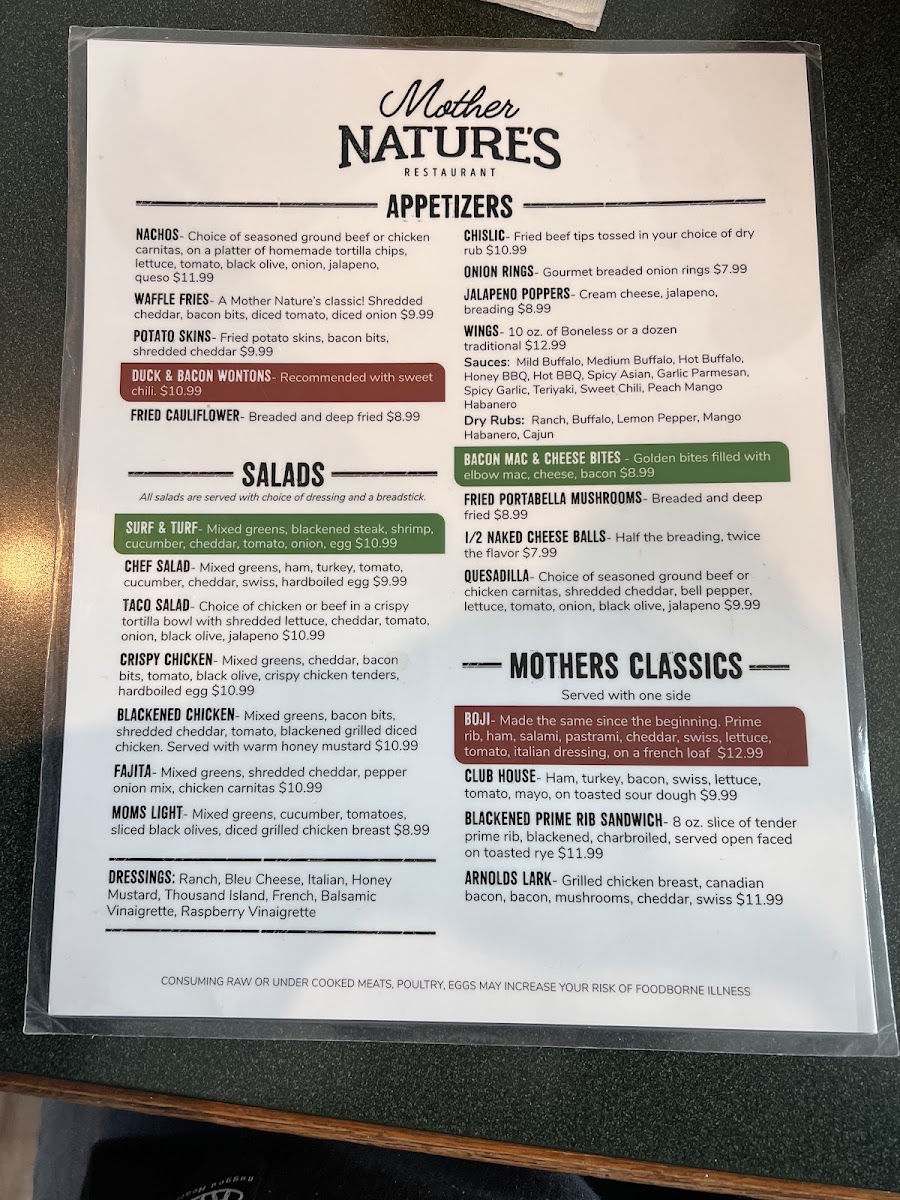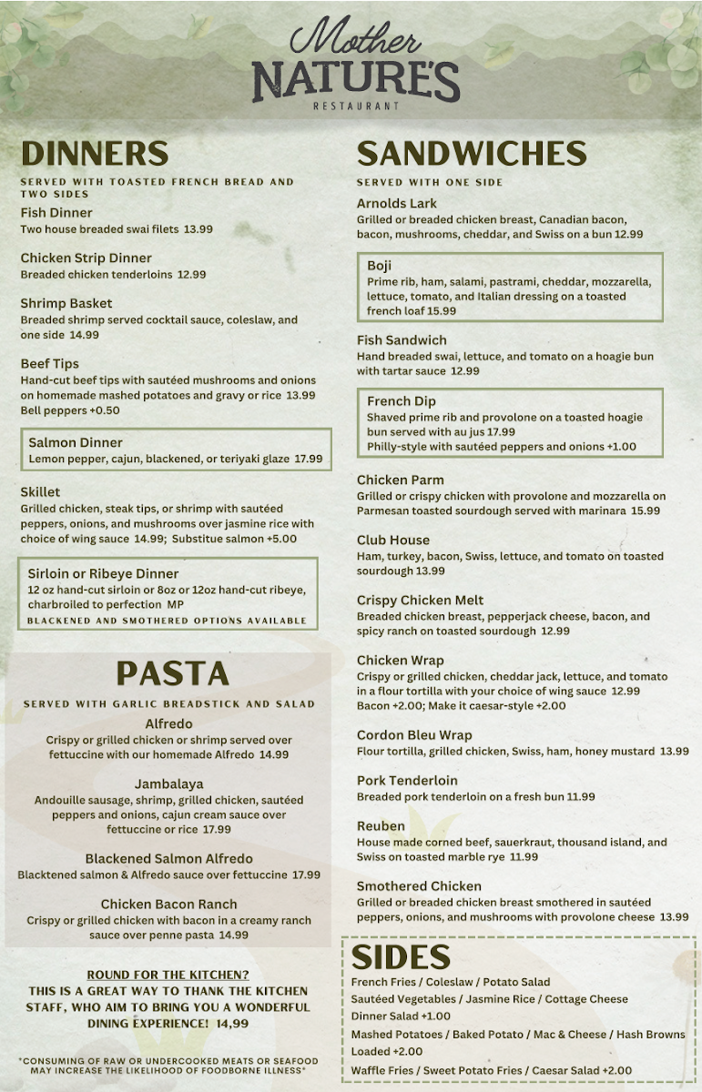 Mother Nature’s Restaurant offers a straightforward and inviting American-style menu that feels right at home in a casual dining setting. The menu presents a mix of comforting classics and satisfying flavors designed to suit various mealtimes, whether it’s a relaxed lunch break or a laid-back dinner with family and friends.